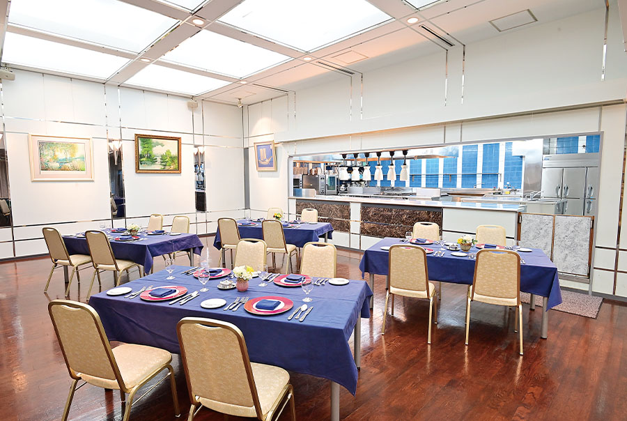 本校にはプロ用の設備や機器が揃っており、調理から料理提供までのプロセスを大切にするため、「レストラン経営実習室」「サービス実習室」などを完備しています。