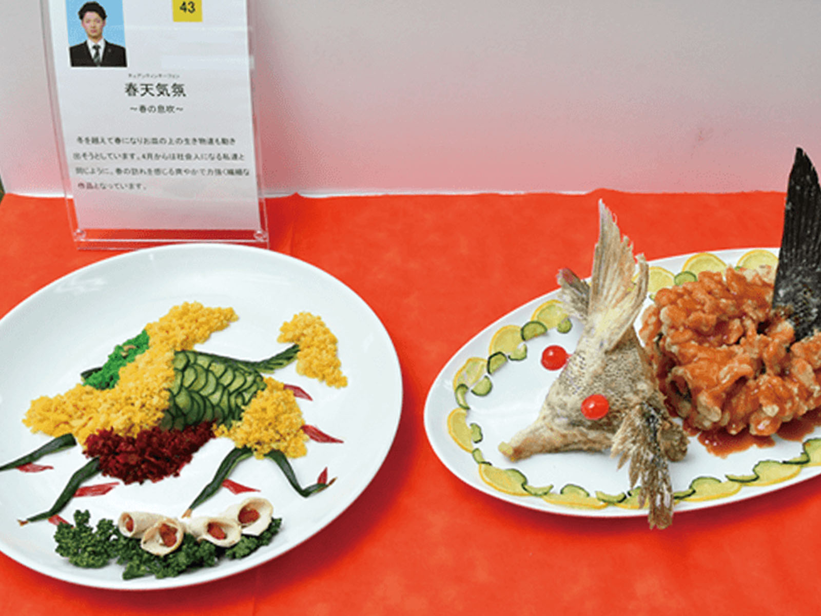 中華鍋の扱い方・卵の火入れ方法などを確認しています。その他に、人参の飾り切りなどの試験を行います。