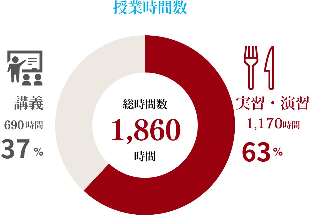 1年次は西洋料理、日本料理、中国料理の基礎技術、技術に裏付けられる理論など調理師免許取得のためのカリキュラムです。2年次からは選択コース分野の専門技術を習得。実習時間が非常に多い、実践的なカリキュラムになっています。
