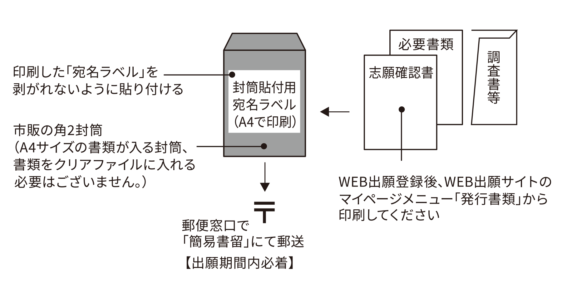 STEP 6志願確認書をカラー印刷し、出願書類を郵送する(出願最終日必着)①WEB出願サイトのマイページのメニュー「発行書類」から「志願確認書」をダウンロード・カラー印刷し、各入試で必要な出願の郵送書類をご用意ください。