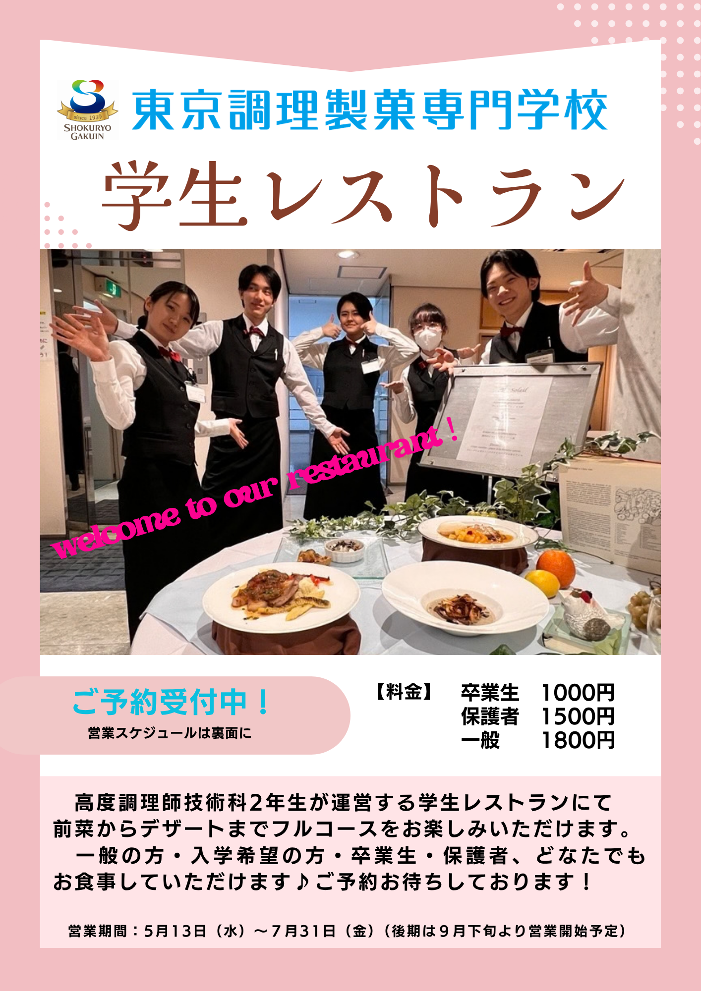 5/13(水)より高度調理師技術科の2年生が運営する学生レストランがOPENいたします!