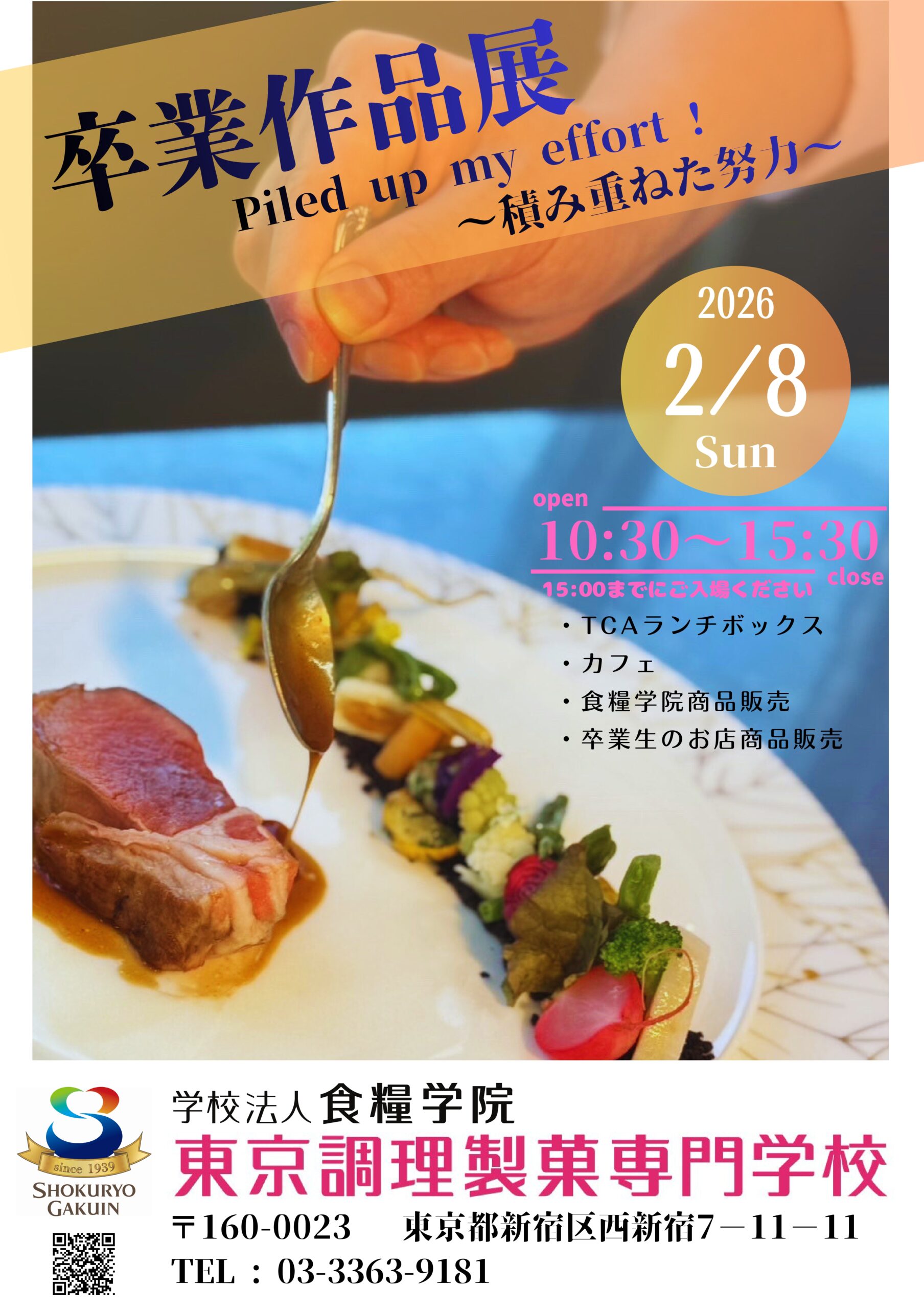 高度調理師技術科2年生、調理師技術科、パティシエ・ブーランジェ科・国際調理ビジネス科の卒業年次の学生が一人一作品作成展示します。